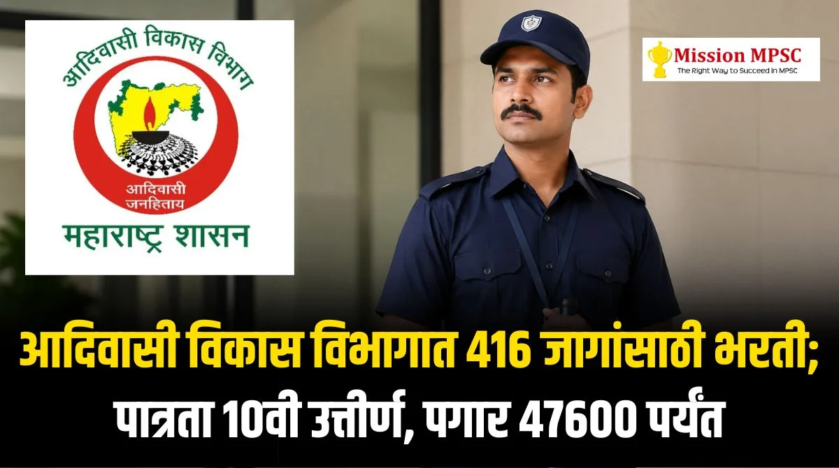 आदिवासी विकास विभागात 416 जागांसाठी भरती; पात्रता 10वी उत्तीर्ण, पगार 47600 पर्यंत